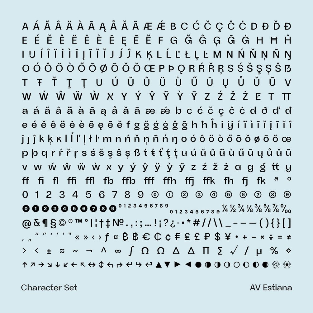 AV Estiana is a uniwidth sans serif typeface designed for effortless layout adaptability.